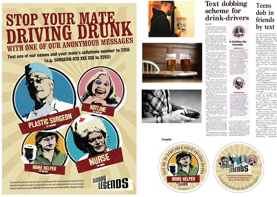 Young men in NZ find it difficult to tell their friends not to drink then drive home. We wanted to give them a way to intervene anonymously and any avoid awkward confrontation. So we encouraged them to text their mate's mobile number to a short code, which in turn sent a pre-recorded sober driving message from the ‘Bloody Legends’ to their mate's phone warning of the dire consequences of drinking and driving in a serious but light-hearted way.