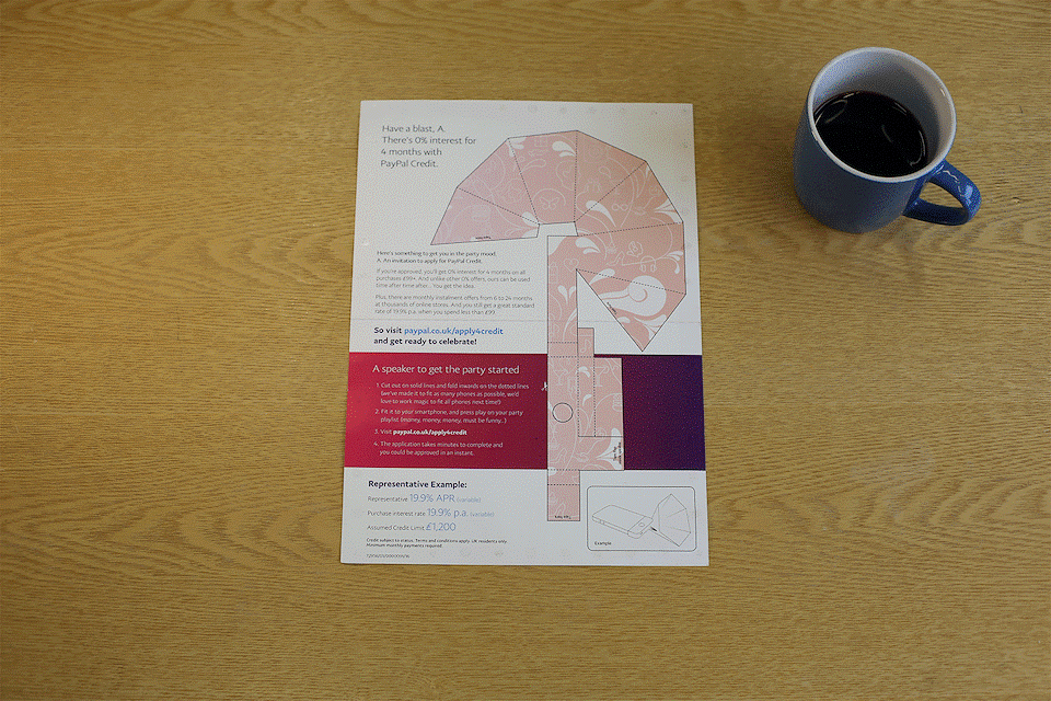 0% interest for 4 months! Who could possibly have 0% interest in that? Well, for some of PayPal’s customers, this great deal hadn’t got them going at all. We’d been mailing and emailing for 5 months…and nothing. Zip, zilch, nada. How could we get them to listen to us? If 0% interest hadn’t got them buzzing, the enjoyment they could have buying all the stuff they wanted, just might. So, we chose to celebrate our offer. To amplify it. To give our audience something worth keeping. And above all, make it FUN!
